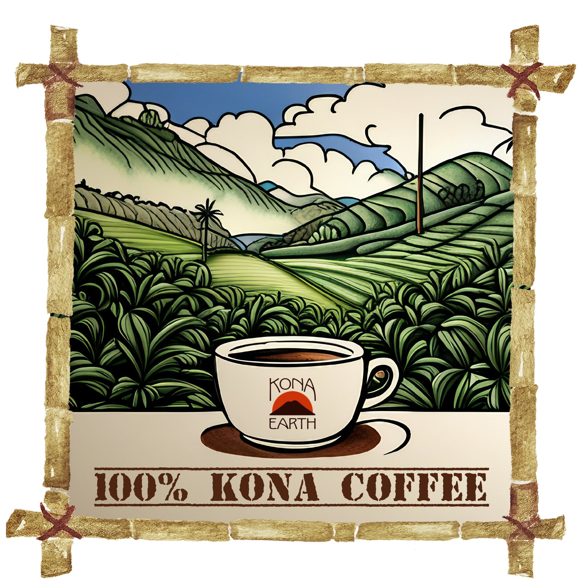 The Kona Earth brown t-shirt sports custom artwork depicting the Kona Earth farm with a cup of Kona coffee at the center.