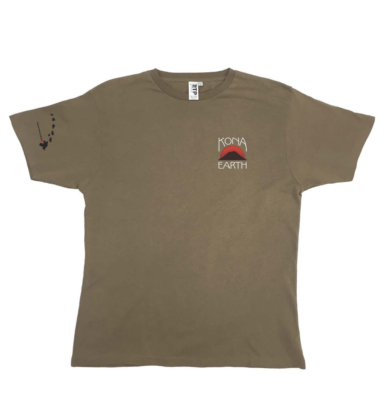 Made with pre-treated 100% combed ring-spun cotton and made by RPT Apparel, the front of the t-shirt proudly displays the Kona Earth logo, while the right shows the Hawaiian island chain. Unisex sizing in small, medium, large, and extra large. Coyote brown color.